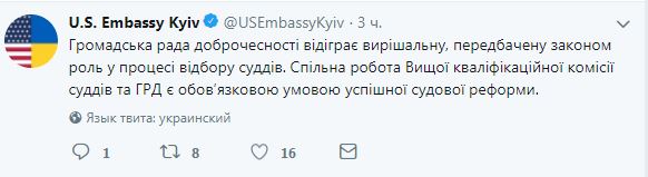 Об этом говорится в официальном комментарии посольства США в Twitter.