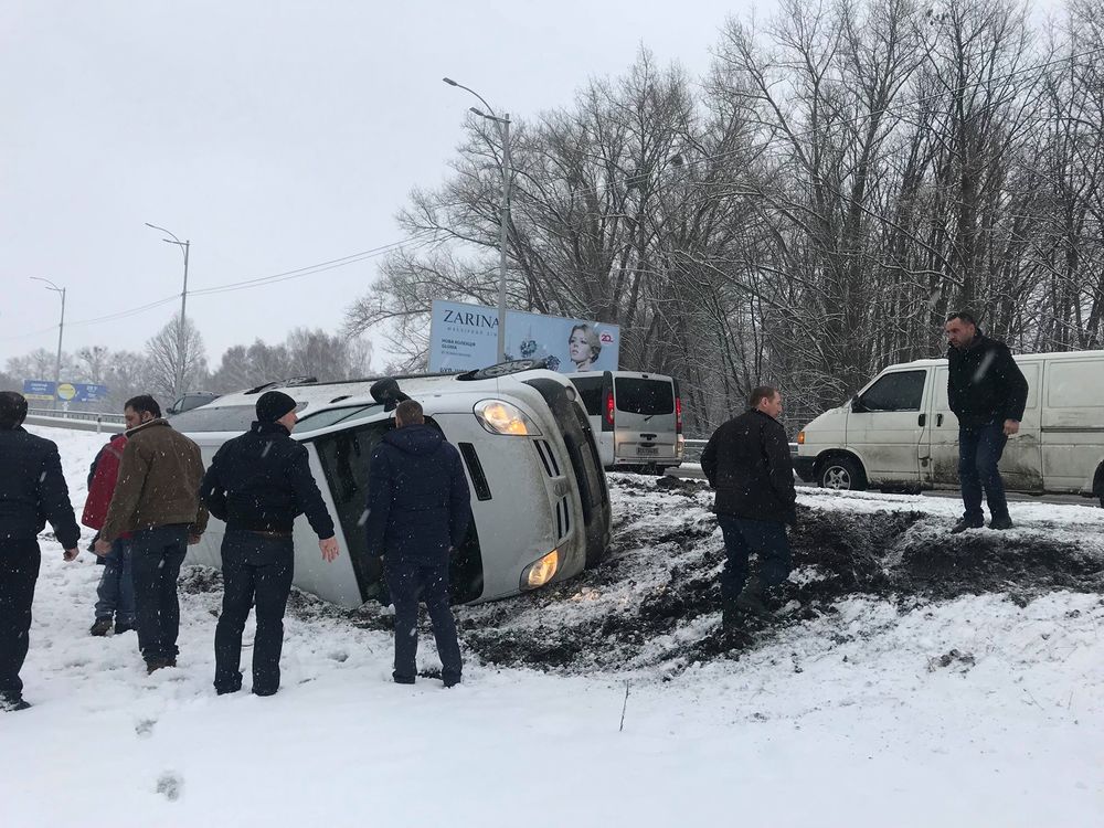 Первую машину просто занесло на отбойник. Второе авто, белый микроавтобус, перевернулось и слетело в кювет.