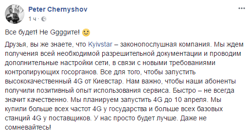 Он отметил, что компания "Киевстар" ждет получения всей необходимой разрешительной документации и проводит дополнительные настройки сети в связи новыми требованиями контролирующих госорганов.