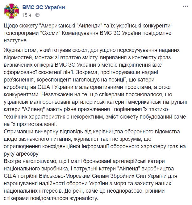 В ВСУ прокомментировали расследование журналистов "Схем" о списанных катерах береговой охраны США Island, передачу которых Украине затягивают наши чиновники из-за коммерческого интереса завода Петра Порошенко "Кузница на рыбацкой", который строит катера на госзаказ.