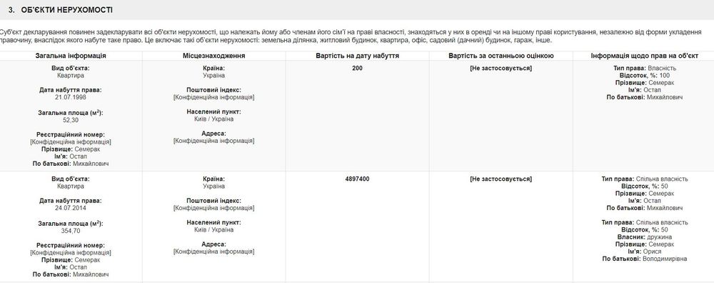 Кроме того, Семераку принадлежит Jaguar S-type 2006 года выпуска, приобретенный за 295,7 тысяч гривен, и Volkswagen Touareg 2011 года выпуска за 993 тысячи грн. Жена министра владеет правом на третий автомобиль - Тoyota Camry 2011 года выпуска за 265 тысяч.