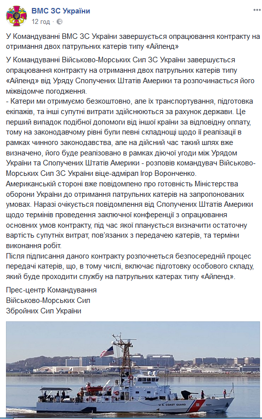 "В командовании Военно-Морских Сил ВС Украины завершается проработка контракта на получение двух патрульных катеров типа "Айленд" от правительства Соединенных Штатов Америки и начинается его межведомственное согласование.