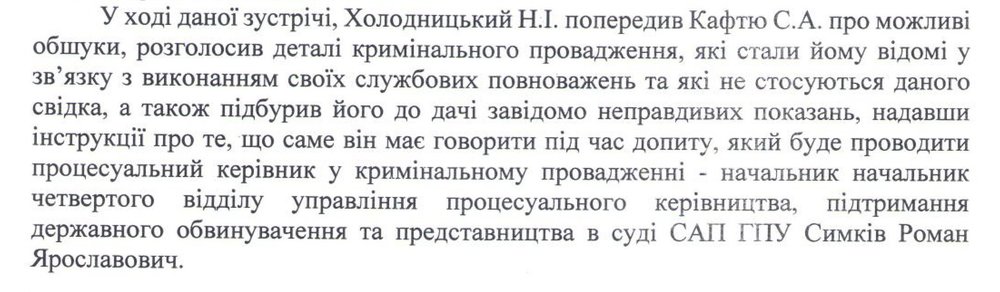 Во время встречи Холодницкий якобы предупредил Сергея Кафтю о возможных обысках, а также рассказал подробности уголовного дела.