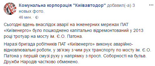 "Сегодня днем в результате аварии на инженерных сетях ПАО "Киевэнерго" был поврежден капитально отремонтированный в 2013 году тротуар на мосту им. Патона. Сейчас бригада рабочих ПАО "Киевэнерго" выполняет аварийно-восстановительные работы, в связи с чем движение транспорта по мосту им. Патона в первой полосе движения в направлении с ул. Соборности на ул. Дружбы Народов частично ограничено", - отмечается в сообщении.