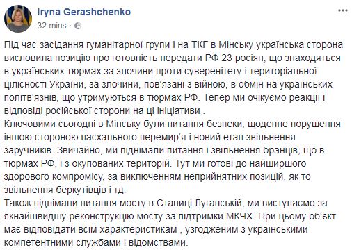 "Во время заседания гуманитарного группы в Минске и на ТКГ украинская сторона выразила позицию о готовности передать РФ 23 россиян, находящихся в украинских тюрьмах за преступления против суверенитета и территориальной целостности Украины, за преступления, связанные с войной, в обмен на украинский политзаключенных, содержащихся в тюрьмах РФ. Скажу так: мы ожидаем реакции и ответа российской стороны на эти инициативы", - написала она.