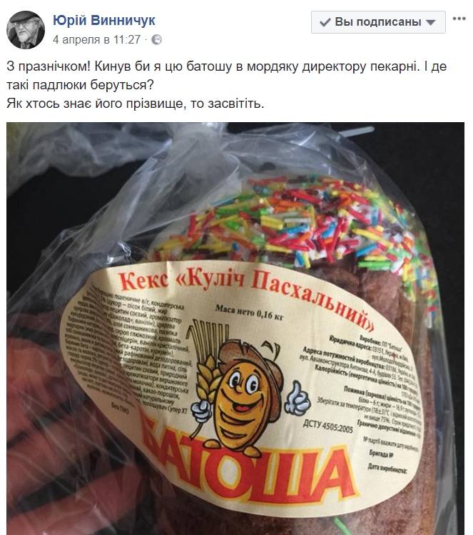 Писатель Юрий Винничук предложил "кинуть эту батошу в мордяку директору пекарни".