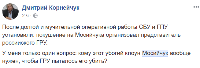 У меня только один вопрос: кому этот убогий клоун Мосийчук вообще нужен, чтобы ГРУ пыталось его убить?"