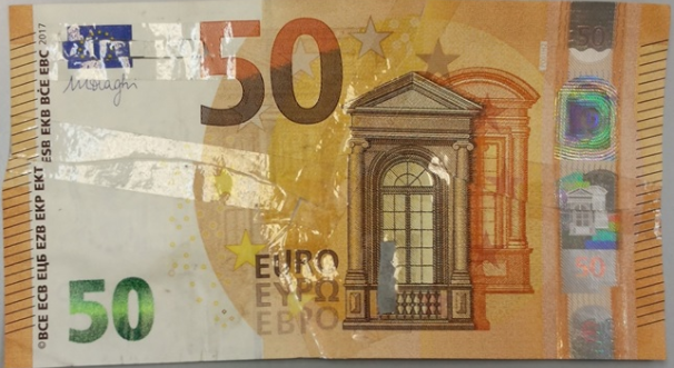 К нацбанковской телеграмме прилагаются фото поврежденных банкнот 50 евро, которые выявлены Ивано-Франковским филиалом Приватбанка во время инкассации терминалов. Каждая купюра сложена из четырех частей настоящих купюр серии "Европа", введенных в оборот 4 апреля 2017 г., которые склеены прозрачной клейкой лентой.