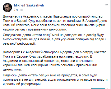 Лишенный украинского гражданства экс-губернатор Одесской области, лидер движения "Рух новых сил" Михаил Саакашвили, которому накануне Пасхи привезли из Украины сало, грибы и самогон, рассказал о трудоустройстве в качестве лектора в Академии спикеров в Нидерландах. Об этом он написал на своей странице в Facebook.