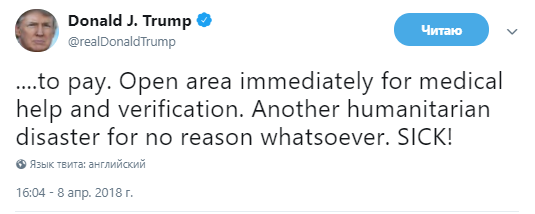 "Множество погибших, в том числе женщин и детей, в бессмысленной химической атаке в Сирии", - написал Трамп отметив, что зона поражения химоружием заблокирована и окружена сирийской армией. Сейчас она "полностью недоступна для внешнего мира".