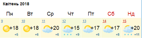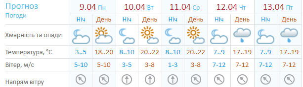 Сайт Укргидрометцентра прогнозирует теплую неделю до +17...+22 днем. При этом ночи обещают довольно прохладные +3...+10. В четверг и пятницу возможен небольшой дождь.