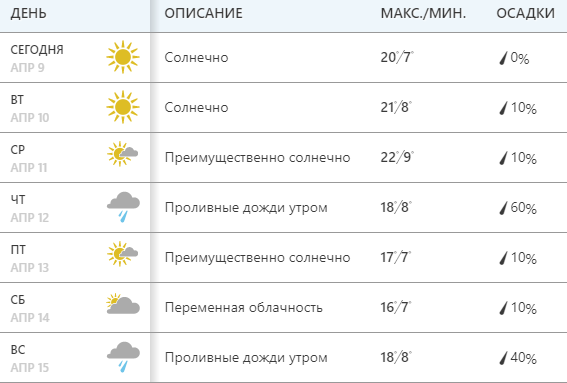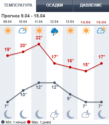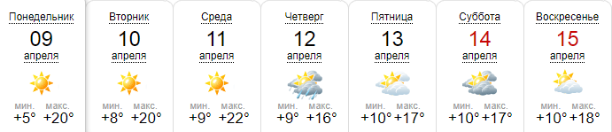 Первые три дня недели киевлян порадует солнышко и тепло до +20...+22. Утром в четверг пойдет дождь, температура снизится до +17 и поднимется до +19 к воскресенью. При этом одни ресурсы считают, что дождь будет только 12 апреля, вторые не исключают дождь утром 15 апреля.