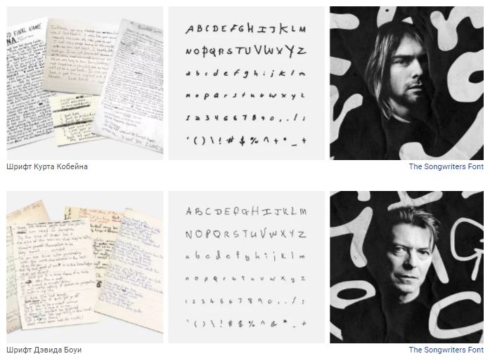 Графический дизайнер Николя Дамьен разработал шрифты на основе почерков Курта Кобейна, Дэвида Боуи, Джона Леннона, Леонарда Коэна и Сержа Генсбурга.