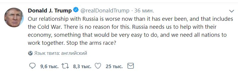 "Наши отношения с Россией сейчас хуже, чем когда-либо, включая период холодной войны. Для этого нет причины. Россия нуждается в нас. Им нужна помощь с их экономикой, это было бы очень легко сделать.Нам нужно, чтобы все нации работали вместе, - написал Трамп.