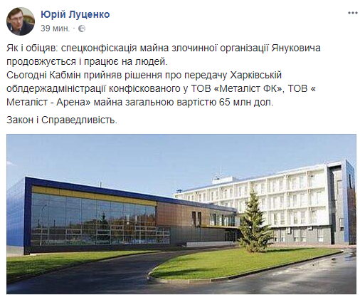 "Как и обещал: спецконфискация имущества преступной организации Януковича продолжается... Сегодня Кабмин принял решение о передаче Харьковской облгосадминистрации конфискованного у ООО "Металлист ФК", ООО "Металлист–Арена" имущества общей стоимостью 65 млн долл.", - написал генпрокурор на своей странице в Facebook.