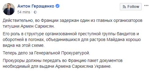 Во Франции задержали организатора так называемых "титушек" Армена Саркисяна. Об этом сообщил советник МВД Антон Геращенко у себя в Facebook.