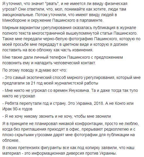 "Они в довольно вежливой форме и с улыбкой (пока не буду называть их имена) сказали, что люди хотят "рвать" Новое Время, но есть и другой вариант, - пишет Сыч. - Я уточнил, что значит "рвать", и не имеется ли ввиду физическая угроза? Они ответили, что, мол, понимайте как хотите, люди там эмоциональные. Потом уточнили, что имеют ввиду людей в Минобороне и окружение Пашинского в парламенте.