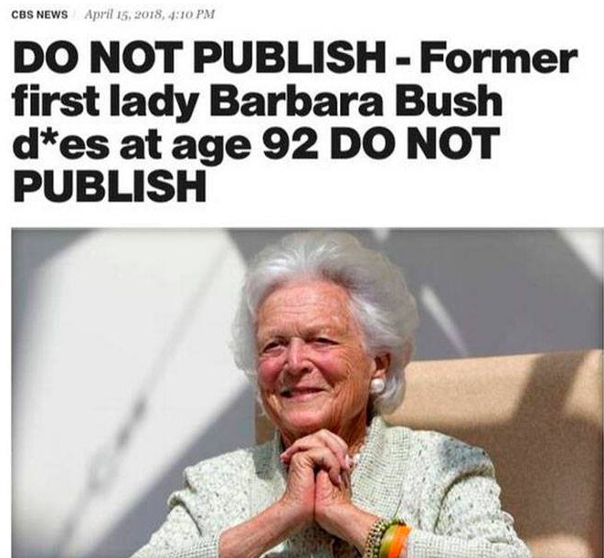 Новостная служба американского телеканала CBS ошибочно разместила на сайте некролог о жене экс-президента США Джорджа Буша-старшего Барбаре, которая сейчас находится в госпитале.