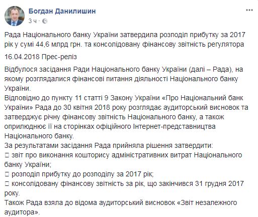 Об этом сообщил глава Совета Нацбанка Богдан Данилишин на своей странице в Facebook.