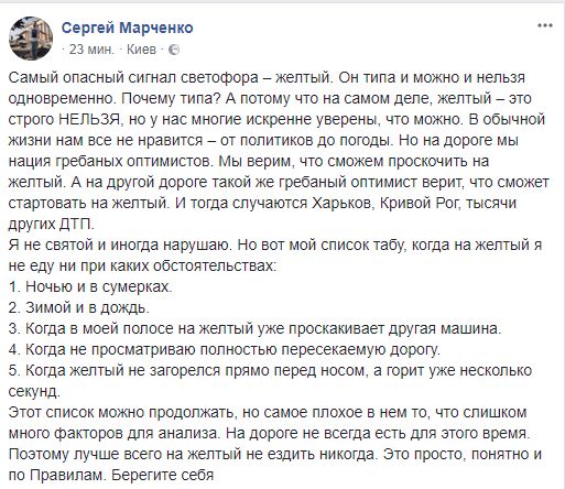 Блогер Сергей Марченко написал пост на эту тему: "Самый опасный сигнал светофора – желтый. Он типа и можно и нельзя одновременно. Почему типа? А потому что на самом деле, желтый – это строго НЕЛЬЗЯ, но у нас многие искренне уверены, что можно. В обычной жизни нам все не нравится – от политиков до погоды. Но на дороге мы нация гребаных оптимистов. Мы верим, что сможем проскочить на желтый. А на другой дороге такой же гребаный оптимист верит, что сможет стартовать на желтый. И тогда случаются Харьков, Кривой Рог, тысячи других ДТП.