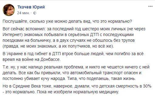 Трагедию прокомментировал и журналист Юрий Ткачев: "Послушайте, сколько уже можно делать вид, что это нормально? Вот сейчас вспомнил: за последний год шестеро моих личных (не через Интернет) знакомых побывали в серьезных ДТП с последующими поездками на больничку, а в двух случаях не обошлось без трупов (правда, не моих знакомых, а их попутчиков, но все же).