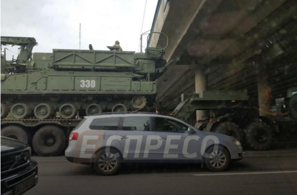 В Киеве военный тягач с БТР застрял под путепроводом