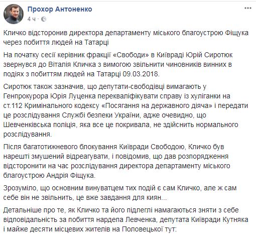 "В начале сессии Киеврады руководитель фракции "Свобода" Юрий Сиротюк обратился к Виталию Кличко с требованием освободить чиновников, виновных в событиях с избиением людей на Татарке 09.03.2018 года. Сиротюк также отметил, что депутаты-"свободовцы" требуют у генпрокурора Юрия Луценко переквалифицировать дело с "хулиганки" на статью 112 Уголовного кодекса "Посягательство на государственного деятеля" и передать это расследование Службе безопасности Украины, ведь очевидно, что Шевченковская полиция, которая все это покрывала, не проведет нормальное расследование", - написал он.