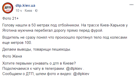 "Голову нашли в 50 метрах под отбойником. На трассе Киев-Харьков у Яготина мужчина перебегал дорогу прямо перед фурой. Водитель не сразу понял, что произошло, и протянул тело под колесами еще метров 100. Делаем выводы, товарищи пешеходы", - указано в опубликованном сообщении.
