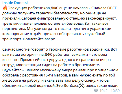 "Сейчас многие говорят о героизме работников водокачки. Вот вам наша история. На ДФС работают семьями – это всем известно. Прямо сейчас, супруга одного из раненных вчера сотрудников станции сидит на работе в бронежилете. Вдумайтесь. Вашего мужа/жену вчера ранили при прицельном обстреле с расстояния 15-ти метров, а вам нужно ехать по той же дороге на работу, и вкалывать там целую смену, чтобы обеспечить людей водичкой. Это Донбасс, здесь такие люди", - говорится в сообщении.