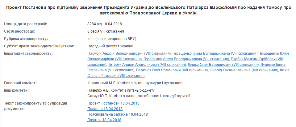 В Верховной Раде зарегистрирован проект постановления о поддержке обращения президента Украины Петра Порошенко к Вселенскому патриарху Варфоломею о предоставлении томоса об автокефалии православной церкви в Украине