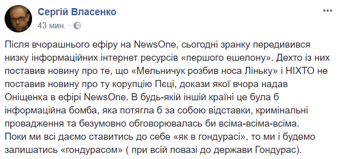 "После вчерашнего эфира на NewsOne сегодня утром пересмотрел ряд информационных интернет-ресурсов "первого эшелона". Некоторые из них поставили новость о том, что "Мельничук разбил нос Линько" и НИКТО не поставил новость о коррупции Пеци, доказательства которой вчера предоставил Онищенко в эфире NewsOne.
