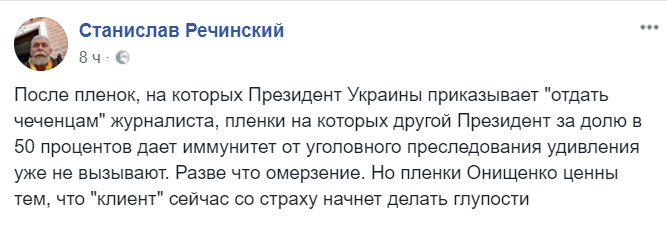 "После пленок, на которых президент Украины приказывает "отдать чеченцам" журналиста, пленки, на которых другой президент за долю в 50 процентов дает иммунитет от уголовного преследования, удивления уже не вызывают. Разве что омерзение. Но пленки Онищенко ценны тем, что "клиент" сейчас со страху начнет делать глупости".