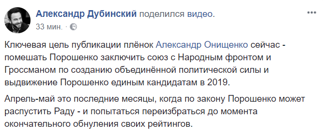"Ключевая цель публикации пленок Александра Онищенко сейчас – помешать Порошенко заключить союз с «Народным фронтом» и Гройсманом по созданию объединенной политической силы и выдвижение Порошенко единым кандидатам в 2019-м.