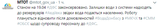 "По состоянию на 19.04 ДФС законсервирована. Остатки воды из системы поступают в резервуары Авдеевки, откуда вода подается населению. Работу планируется возобновить после договоренностей КП ВодаДонбасу с МККК и СММ ОБСЕ по сопровождению персонала к ДФС", - говорится в сообщении.