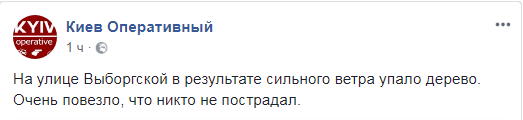 В четверг, 19 апреля в Киеве сильные порыва ветра валят деревья и повреждают авто. В частности, паблик "Киев.Оперативны" сообщает, что на улице Выборгской упало дерево.