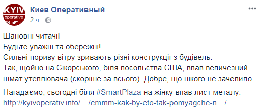 Как сообщала "Страна", в Киеве лист обшивки слетел с нового ТРЦ и рухнул на пенсионерку. На проспекте Победы напротив станции метро "Политехнический институт" порывами сильного ветра сорвало железные листы и перекрытия с нового торгово-развлекательного центра "Смарт Плаза".
