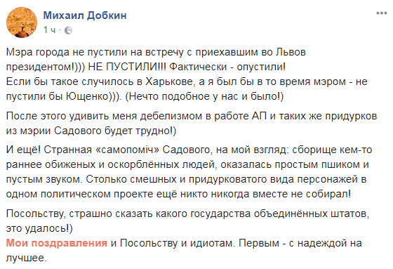 "Мэра города не пустили на встречу с приехавшим во Львов президентом!))) НЕ ПУСТИЛИ!!! Фактически - опустили!", - отметил он.