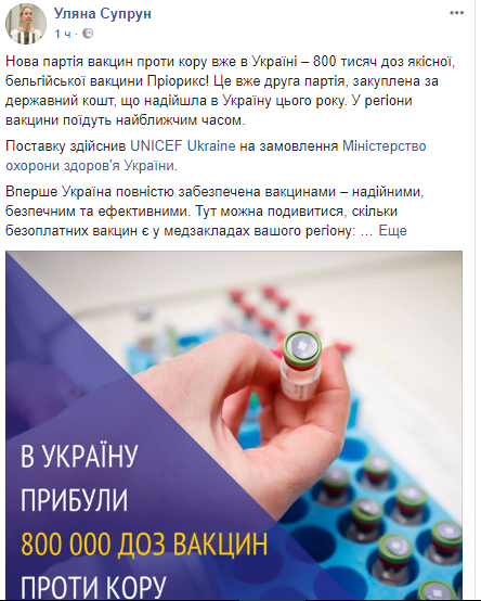 В Украину прибыла новая партия бельгийской вакцины от кори. Об этом сообщила и.о. министра здравоохранения Ульяна Супрун на своей странице в Facebook.