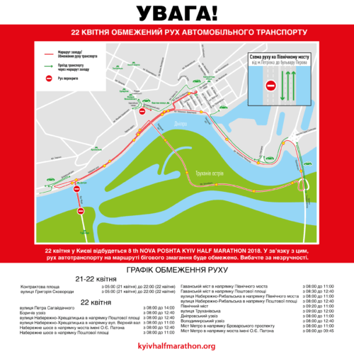 В этом году организаторы мероприятия компания Run Ukraine специально отказались от дистанции 10 км для сокращения времени перекрытия улиц. Организаторы полумарафона рекомендуют водителям заранее планировать свое передвижение по городу, учитывая график перекрытия.