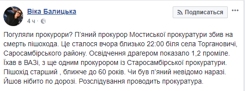 "Это произошло вчера около 22:00 возле села Торгановичи, Старосамборского района. Драгер показал 1,2 промилле. Ехал на ВАЗе, с еще одним прокурором из Старосамборской прокуратуры", - написала журналистка.