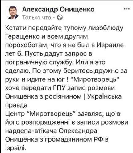 "Передайте тупому лизоблюду Геращенко и всем другим порохоботам, что я не был в Израиле лет 6. Пусть дадут запрос в пограничную службу. Или я это сделаю", - ответил на обвинения Онищенко.