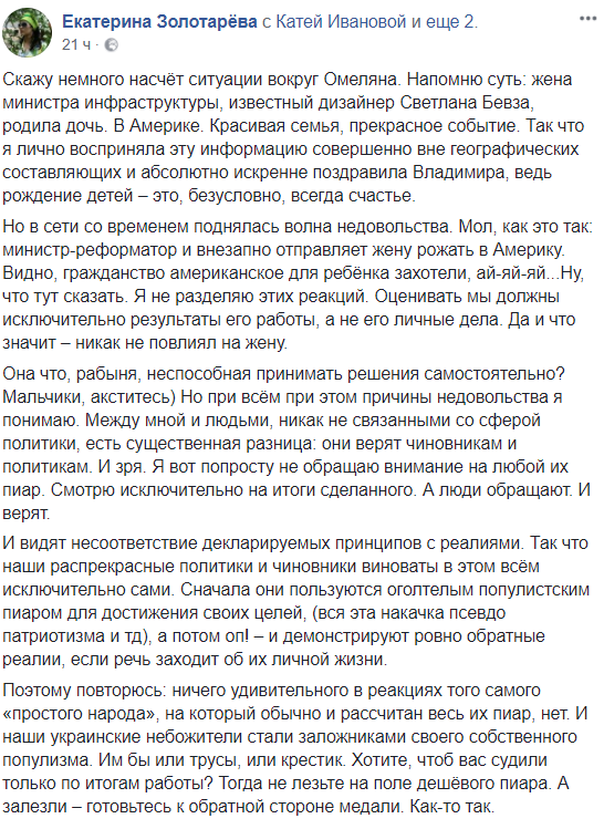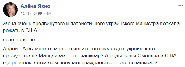 А вы можете мне объяснить, почему отдых украинского президента на Мальдивах – это зашквар? А роды жены Омеляна в США, где ребенок автоматом получает гражданство, – это незашквар?" – пишет блогер Алена Яхно.