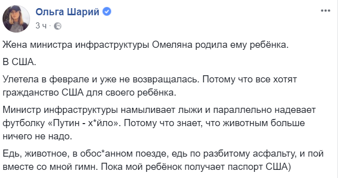 Журналистка Ольга Шарий напомнила, что пока украинцы ездят по разбитым дорогам и на устаревших поездах, министр делает американское гражданство для своего ребенка.