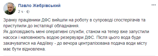 "Как сообщают мне оперативные службы, по состоянию "на теперь" уже запустили насосы и наполняют водой резервуары ДФС. После этого вода будет закачиваться на Авдеевку - к вечеру централизованная подача воды городу должна быть восстановлена", - добавил Жебривский.