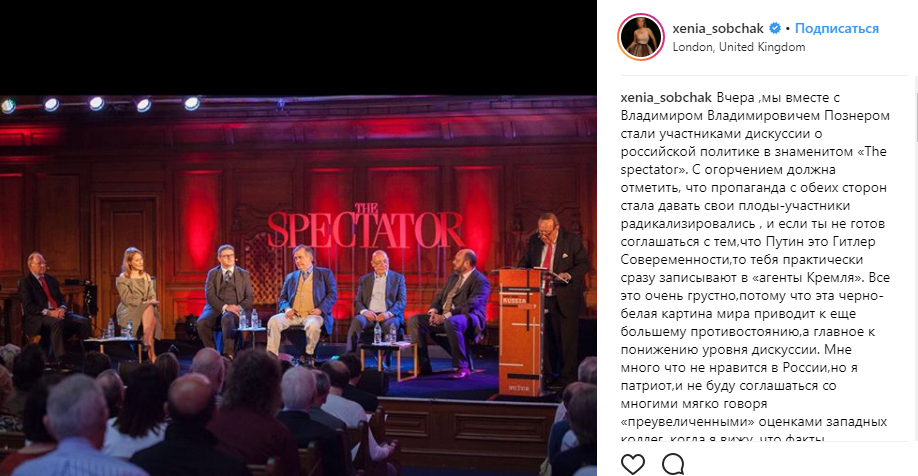 Организатором стал британский журнал The Spectator. В дискуссии также принимал участие Владимир Познер, - написала Собчак в Instagram.