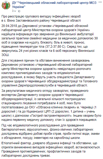 В Черновицкой области отравились 24 ученика  и шесть сотрудников школы. Инцидент произошел в учебном заведении села Викно. Об этом сообщает пресс-служба государственного учреждения Черновицкий областной лабораторный центр Минздрава Украины на своей странице в Facebook.
