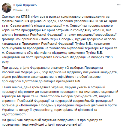 "Сегодня на КПВВ "Чонгар" в рамках уголовного производства по факту совершения государственной измены задержана гражданка Украины, которая, действуя в интересах Российской Федерации, а также неправительственной всероссийской общественной организации "Волонтеры Победы", являясь доверенным лицом кандидата в президенты Российской Федерации Путина В.В., незаконно организовала и проводила на временно оккупированной территории АР Крым и Севастополя сбор подписей в поддержку выдвижения Путина В.В. кандидатом на пост президента Российской Федерации на выборах 2018 года", - сообщил генеральный прокурор Украины Юрий Луценко.