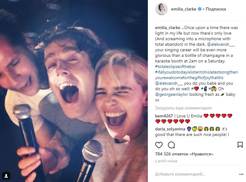 В своем Instagram Эмилия Кларк недавно выкладывала фото с вечеринки с друзьями, а также с новоиспеченным крестником.