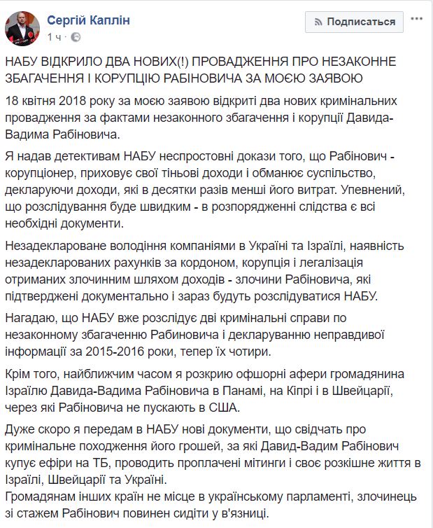 "18 апреля 2018 по моему заявлению открыты два новых уголовных производства по фактам незаконного обогащения и коррупции Давида-Вадима Рабиновича.