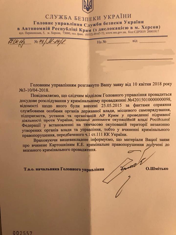 В результате, как следует из писем ведомств, размещенных Портновым, СБУ приобщила его информацию к уже существующему делу, а прокуратура АР Крым внесла новое уголовное производство, которое касается Картошкина, в единый реестр досудебных расследований.